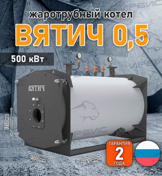 «Вятич 0,5» — водогрейный жаротрубно-дымогарный котел мощностью 0,5 МВт с реверсивной топкой. Котел «Вятич», в зависимости от типа горелочного устройства, может работать на природном газе или жидком топливе и выполнен в газоплотном исполнении с работой под наддувом.